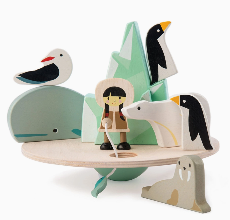 A wooden balancing game for kids by Tender Leaf Toys Practise your balancing skills with this beautiful frozen game! Balance the iceberg, animals and little fishing girl on the wobbly round disc. Set includes; * A balancing polar circle * 2 penguins * Whale * Walrus * Polar bear * Seagull * Iceberg * Friendly fishing girl. Good for stacking and balancing and fine motor skills. Presented in a pretty illustrated colour box. Suitable for 3 years + Product size: L: 20 x W: 20 x H: 4 cms