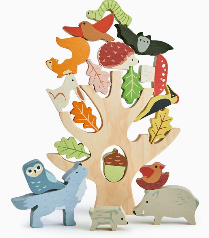 Stacking Forest toy by Tender Leaf Toys A wooden animal stacking and balancing toy for kids, completely plastic-free. This woodland and forest themed stacking tree trunk is a great way to develop your physical and sensory skills. With loads of different pieces this toy provides hours of fun. Set includes: A wooden stacking tree trunk, an owl, a bat, a wolf, a squirrel, a woodpecker, an acorn, a mummy pig with her baby, a caterpillar, five leaves, a toadstool, a moth, a rabbit, a hedgehog, a bird, and a bird in a nest. Crafted from sustainably sourced rubber wood - SVLK - Indonesia’s Timber Legality Verification System Presented in an illustrated colour box.